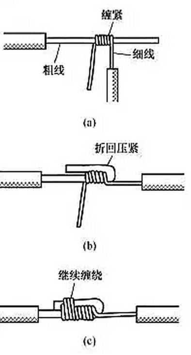 不同截面單股銅導線連接方法如圖3所示,先將細導線的芯線在粗導線的芯線上緊密纏繞 5~6圈,然后將粗導線芯線的線頭折回緊壓在纏繞層上,再用細導線芯線在其上繼續纏繞3~4圈后剪去多余線頭即可。