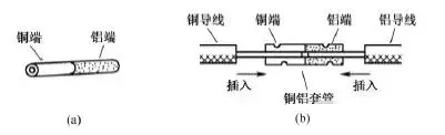 一種方法是采用銅鋁連接套管。銅鋁連接套管的一端是銅質,另一端是鋁質,如圖15(a)所示。使用時將銅導線的芯線插入套管的銅端,將鋁導線的芯線插入套管的鋁端,然后壓緊套管即可,如圖15(b)所示。